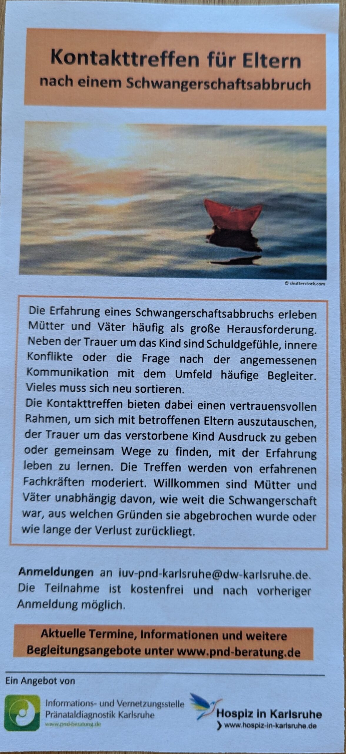 Das Kontakttreffen bietet einen vertrauensvollen Rahmen, um sich mit anderen Eltern auszutauschen, der Trauer um das verstorbene Kind Ausdruck zu geben und Wege zu finden, mit der Erfahrung leben zu lernen. Willkommen sind Mütter und Väter unabhängig davon, wie weit die Schwangerschaft war, aus welchen Gründen sie abgebrochen wurde und wie lange der Verlust zurückliegt.