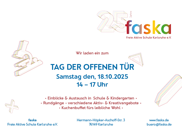 Tag der offenen Tür an der Freien Aktiven Schule + Kindergarten Okt. 18 14:00 – 17:00 Tag der offenen Tür an der Freien Aktiven Schule + Kindergarten